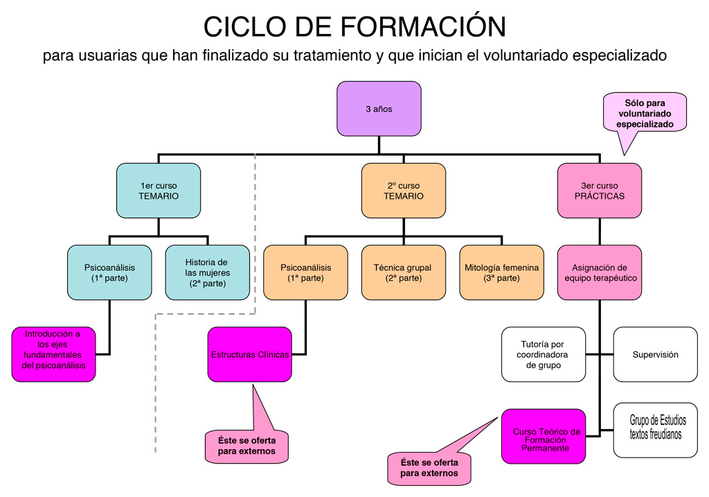 Las mujeres seleccionadas que han pasado por la experiencia de trabajar su problemática en los grupos terapéuticos, se incorporan en el Ciclo Formativo de 3 años consecutivos. Completado el ciclo, se expedirá un diploma y se integrarán en el “Espacio de Formación Permanente” como voluntarias especializadas. A partir de este momento, continuarán su formación práctica en los equipos de intervención como observadoras o auxiliares,