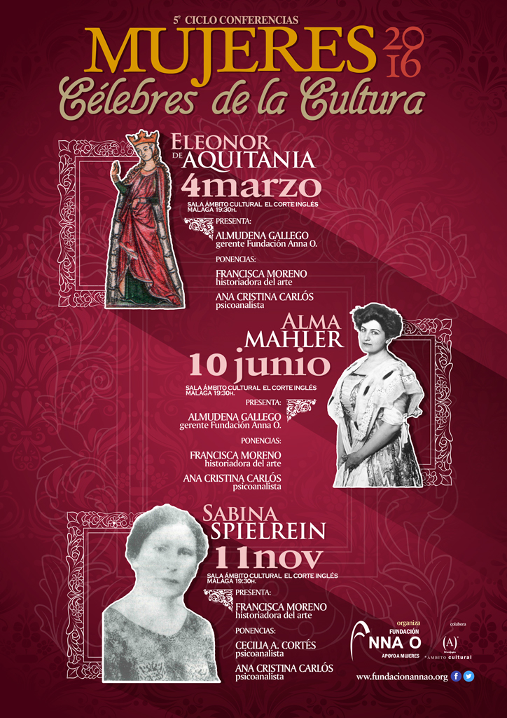 El ciclo "Mujeres Célebres de la Cultura 2016" que se inició el pasado 4 de marzo con una conferencia sobre "Leonor de Aquitania" gran impulsora de trovadores y el denominado "Amor Cortés" en la Edad Media, concluirá el próximo 11 de noviembre con un análisis de la psiquiatra y psicoanalista Sabina Spielrein, igualmente a las 19:30h en la sala Ámbito Cultural.La conferencia contará con las intervenciones de Francisca Moreno, profesora e historiadora del arte y Ana Cristina Carlós, psicoanalista. La presentación de la conferencia y el ciclo correrá a cargo de la gerente de Fundación Anna O. Almudena Gallego, quien dará paso a la proyección de un video mediante el cual se sitúa al personaje en su época y obra elaborado por Francisco J. Núñez del departamento de Comunicación de Fundación Anna O. Tras las conferencias se abrirá un turno de preguntas entre los asistentes para profundizar en diferentes aspectos y resolver dudas. La entrada será libre hasta completar aforo.