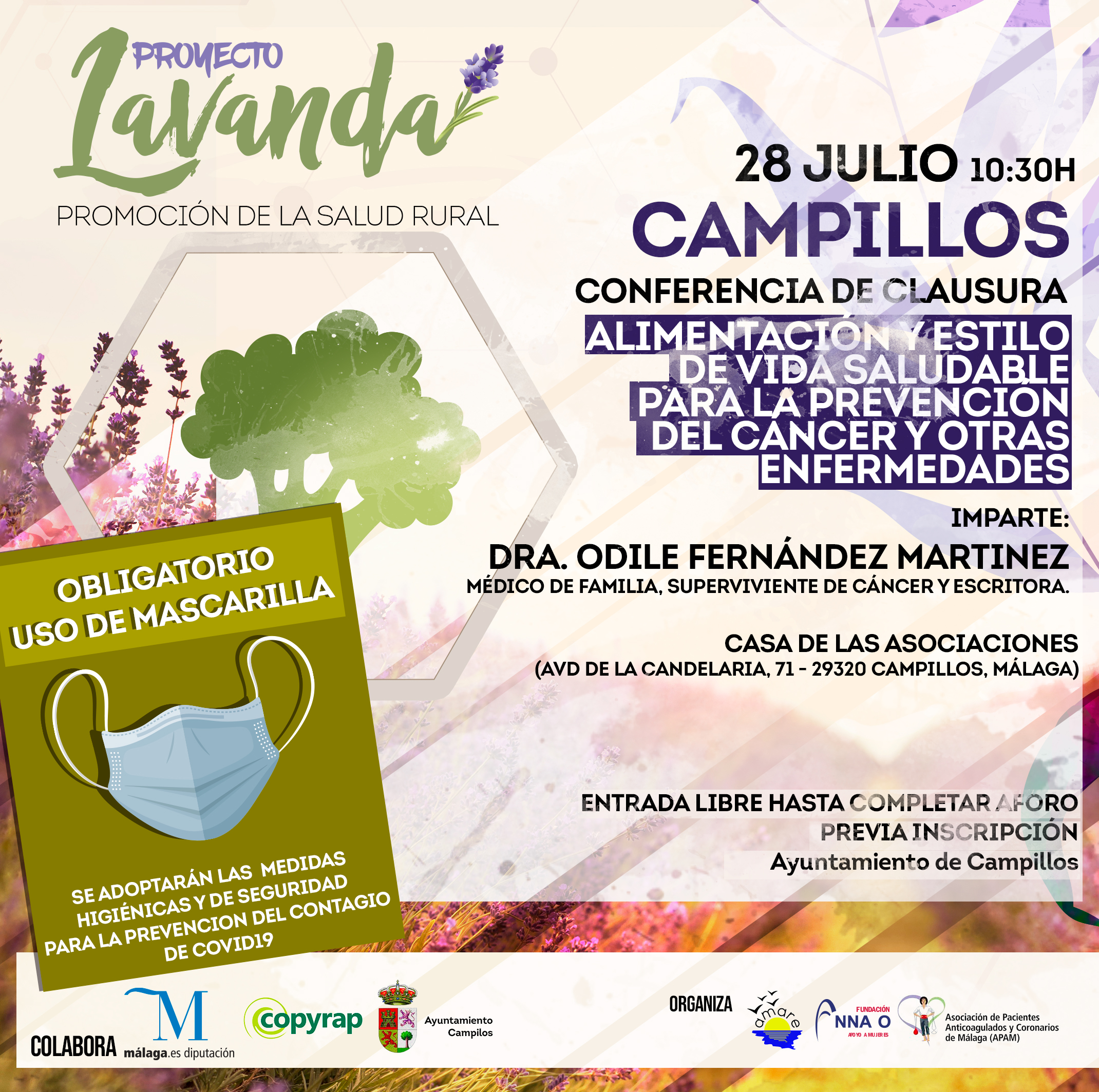Y la Jornada de clausura Alimentación y estilo de vida saludable para la prevención del cáncer y otras enfermedades se celebrará el 28 de julio a las 10:30h en Campillos (Casa de las asociaciones. Avd de la Candelaria, 71). Imparte: Odile Fernández. Médico de familia, superviviente del cancer y escritora. Inscripciones: Ayuntamiento de Campillos