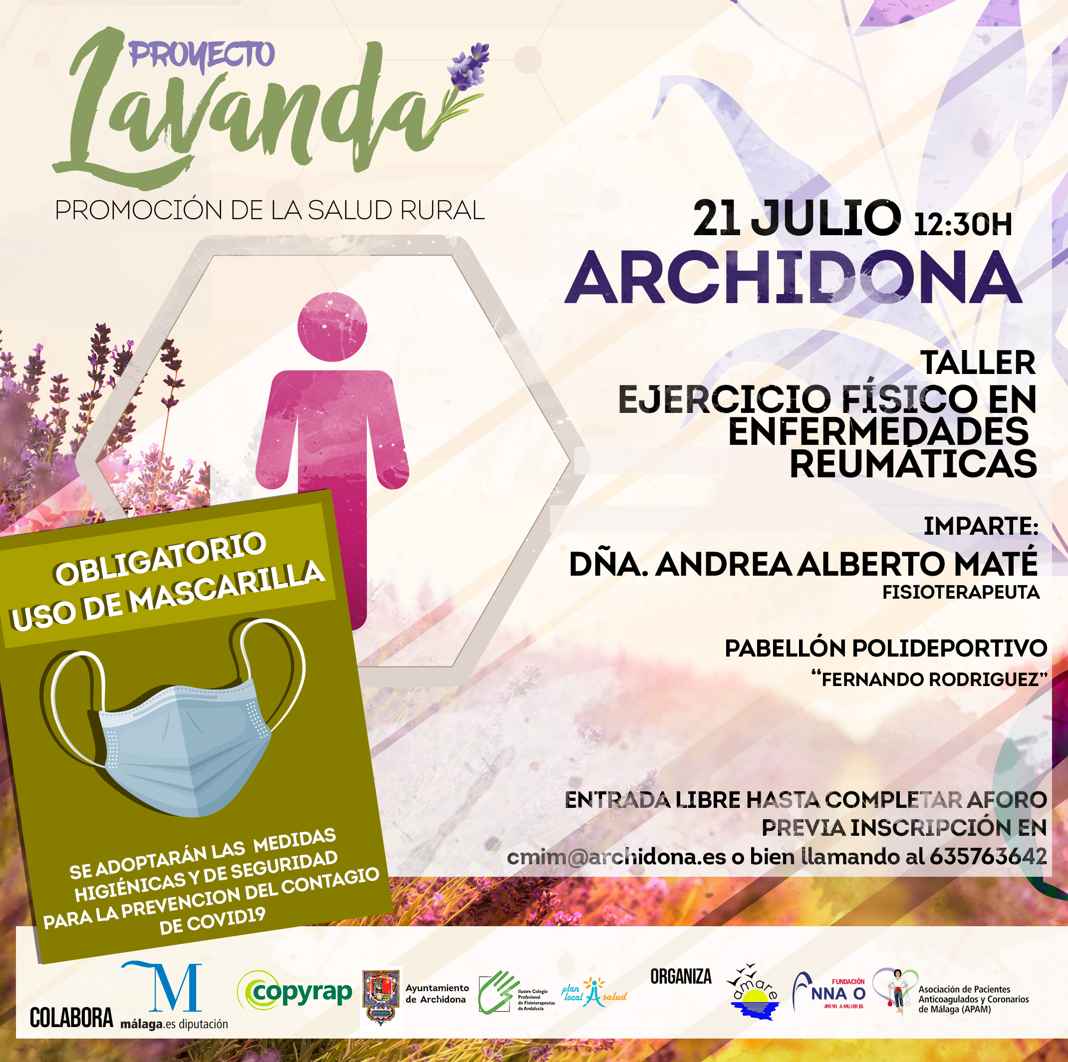 El Taller de Ejercicio Físico en Enfermedades Reumáticas se celebrará el 18 de julio a las 12:30h en el Pabellón polideportivo “Fernando Rodriguez” de Archidona. Imparte: Andrea Alberto Maté. Fisioterapeuta. Inscripciones: